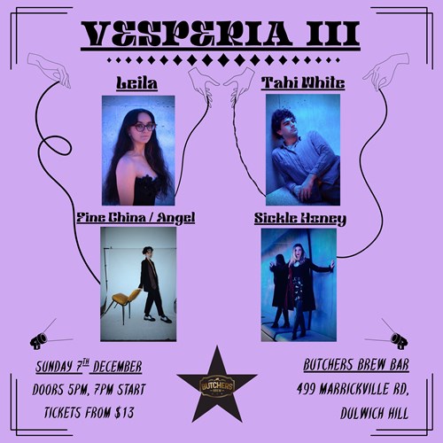 Sun, 7 Dec VESPERIA III - LIVE AT BUTCHERS BREW BAR! Butchers Brew Bar 499 Marrickville Rd, Dulwich Hill |